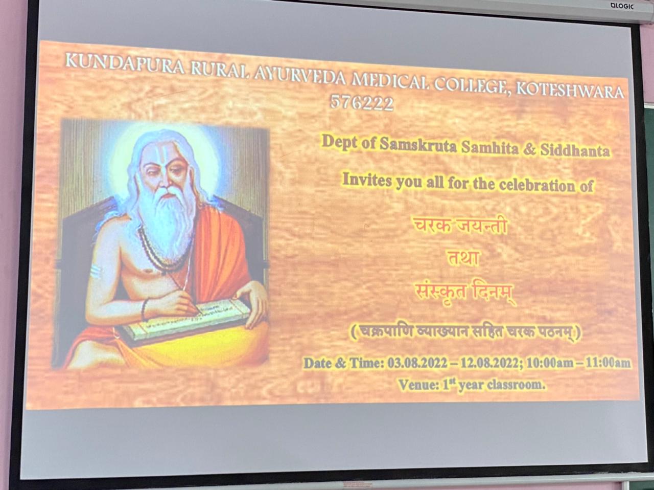 Acharya Charaka, most revered physicians in the Ayurvedic science is assumed to have been born on 5th Day of Shukla paksha in the holy month of Shravana. This auspicious day is celebrated as Charaka Jayanthi by Scholars of Ayurveda. In regard to this Charaka Jayanti was celebrated in the campus encompassing with it Sanskrita Dina Celebrations; which falls on 12th August 2022. To mark the two events, the Samhitha Department of Kundapura Rural Ayurveda College has started Charaka Samhitha Pathana with Chakra pani Vyakhyana on 3rd of August 2022 which continued for a week.